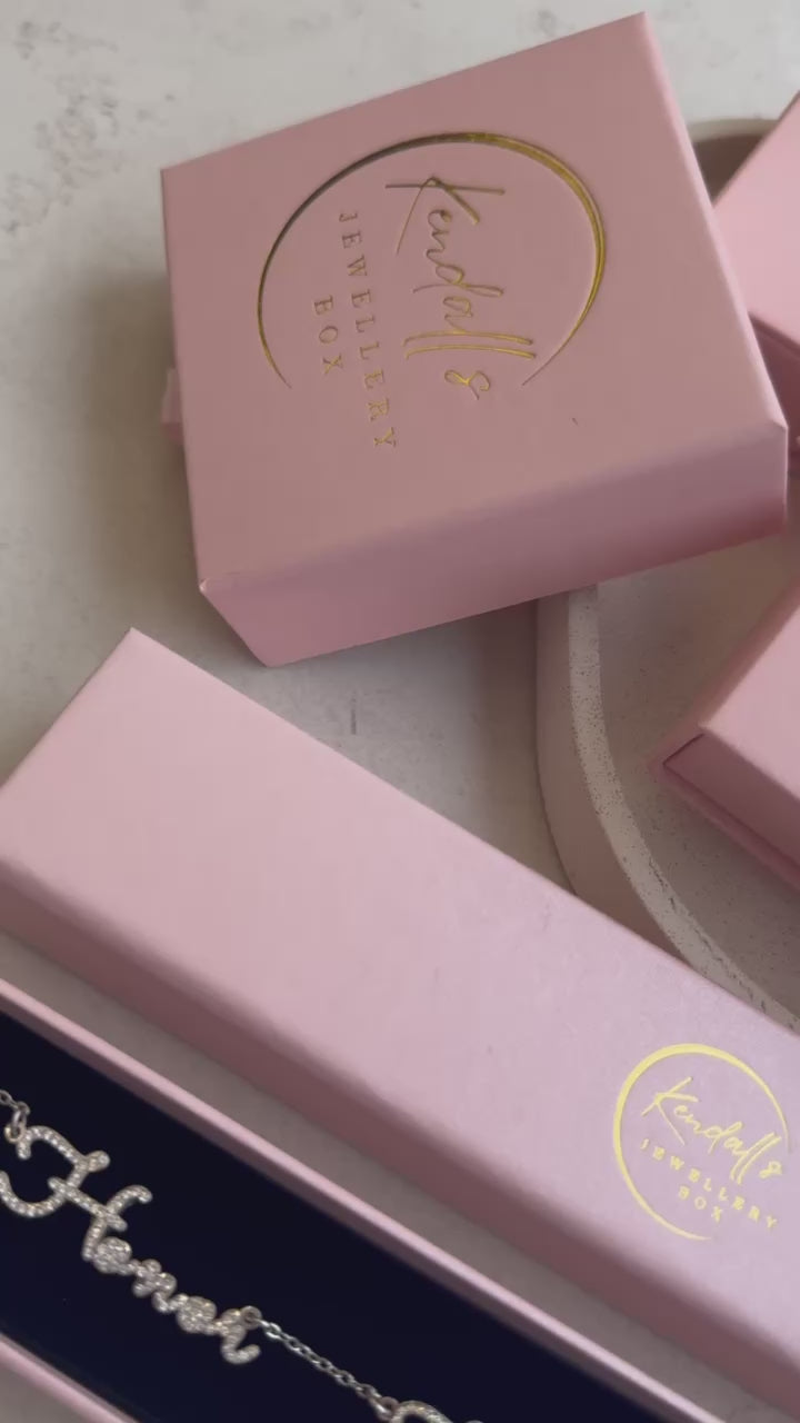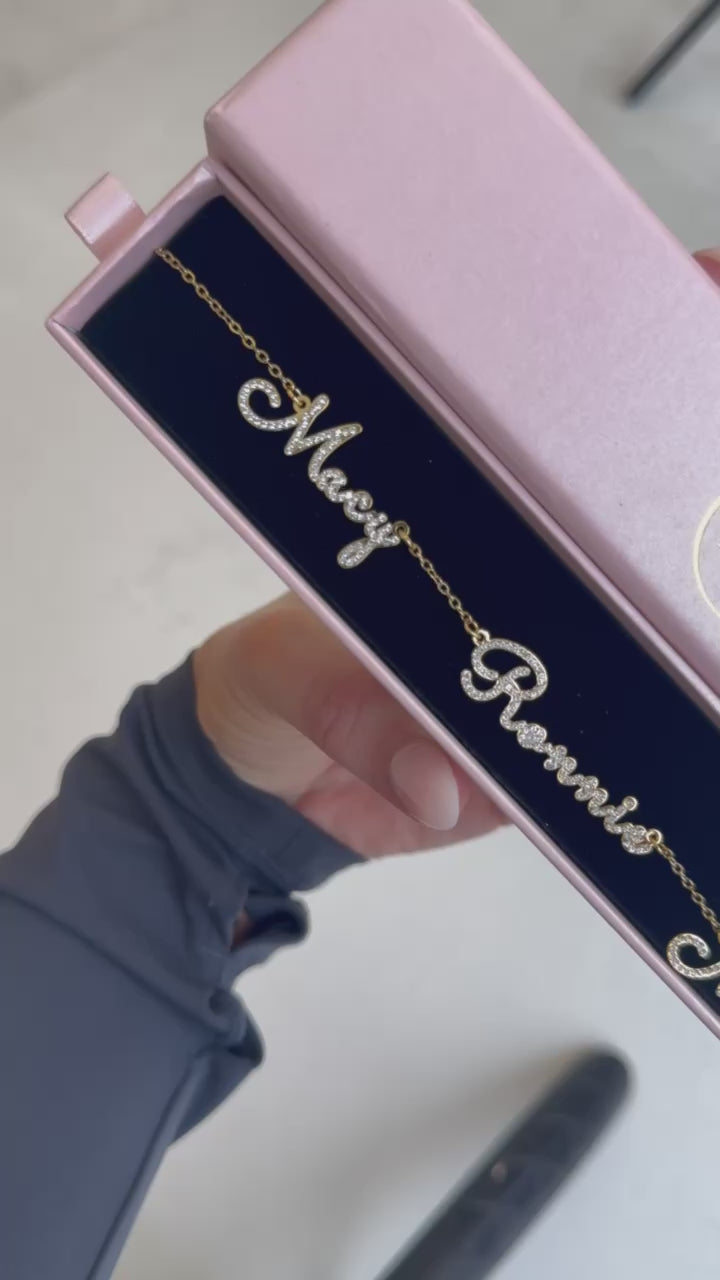 This crystal double name necklace is a stunning, customisable piece available in sterling silver, rose gold, or yellow gold. Choose from 2, 3, 4, or 5 crystal encrusted names, each separated by delicate hearts for added charm or opt for the sleek, heart free design with your desired names. Each name sparkles on a matching chain, creating a luxurious, personal statement that celebrates your loved ones in style. Perfect for adding elegance and sentiment to any look. ✨